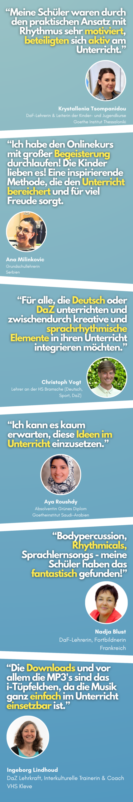Es bestehen viele positive Erfahrungswerte und Rückmeldungen zur erfolgreichen Anwendbarkeit der Übungen, Materialien und Methoden- unabhängig davon, ob du im Ausland DaF oder im deutschsprachigen Raum DaZ unterrichtest. (Siehe Stimmen aus meinen Fortbildungen)